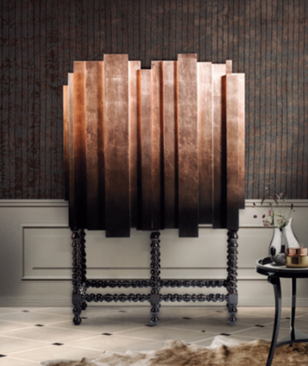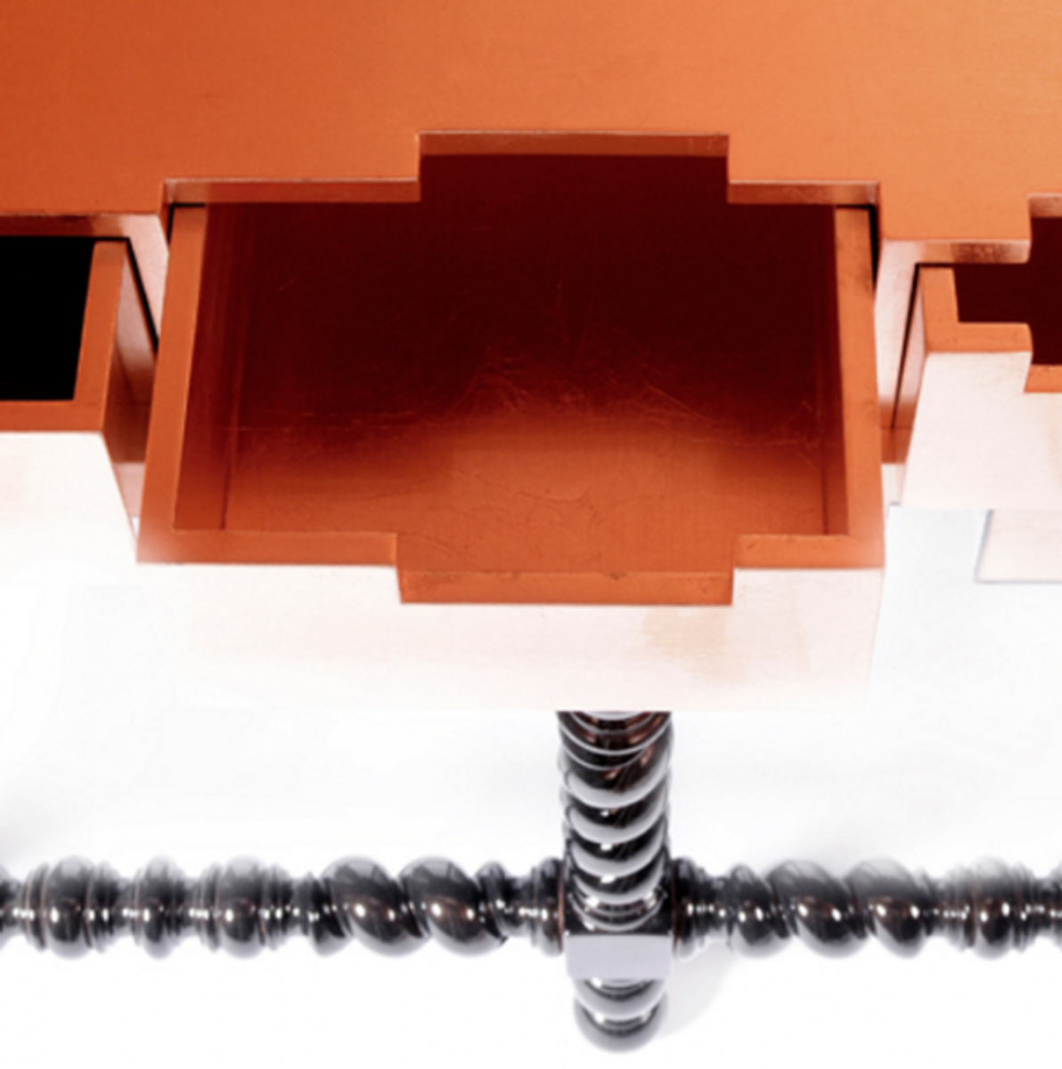 This unique cabinet features a unique finishes and remarkable design elements, inspired in the classic Manueline style. The cabinet surface has a copper leaf finish, with a black lacquer gradient applied on the exterior. Its legs are made from solid mahogany, and are crafted to a traditional form, finished in high gloss black lacquer.