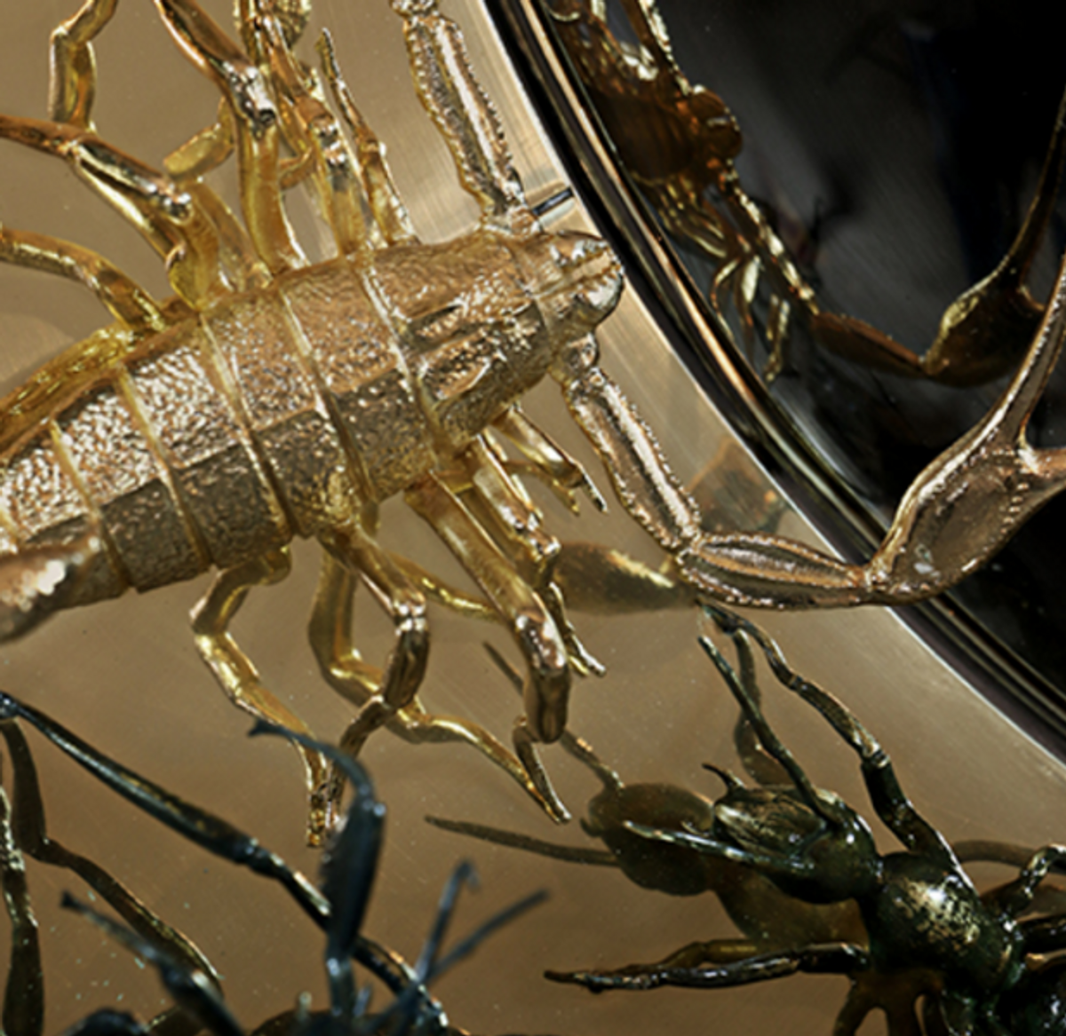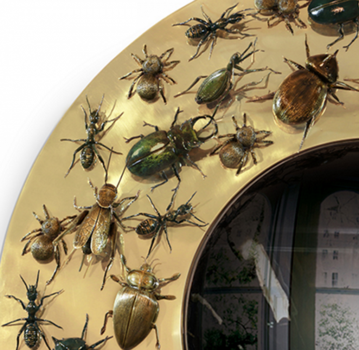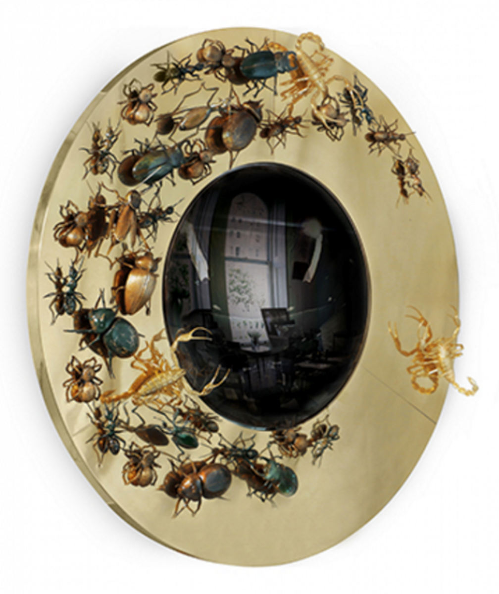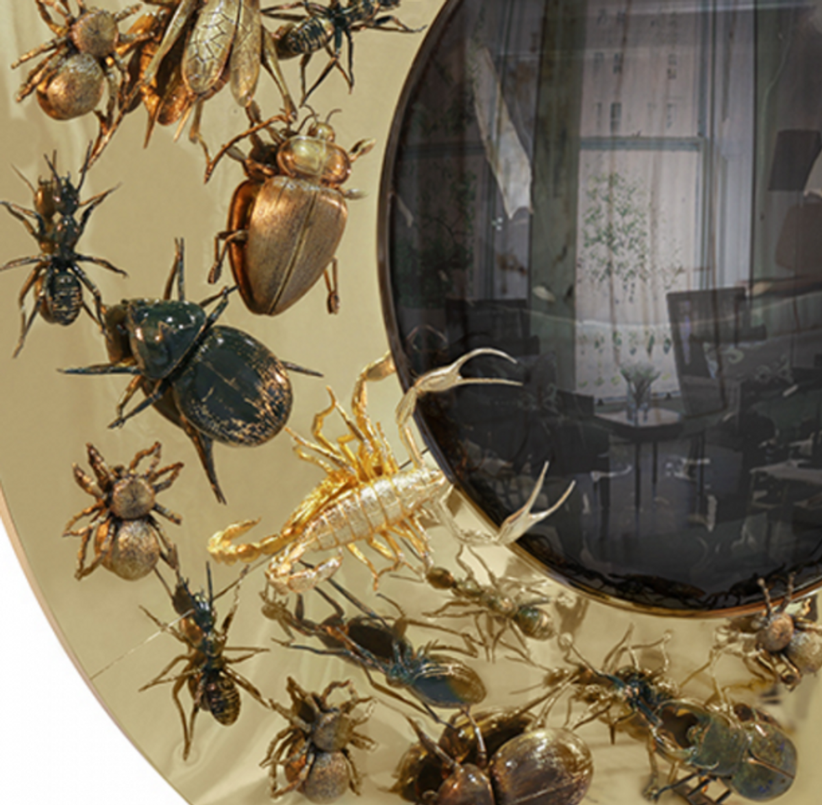 Materials and Finishes: The Convex Metamorphosis Mirror is made from brass. Its concave shape is achieved through the manual hammering of a brass sheet, coated in a nickel bath. Its exterior ring is kept simple, treated with varnish coats, and polished to achieve reflection. The insects are also cast from brass, and undergo a chemical treatment for finish.
