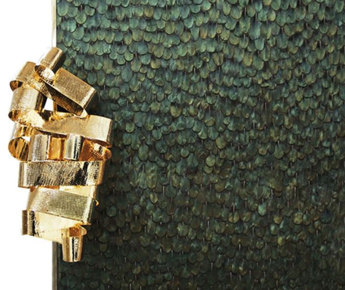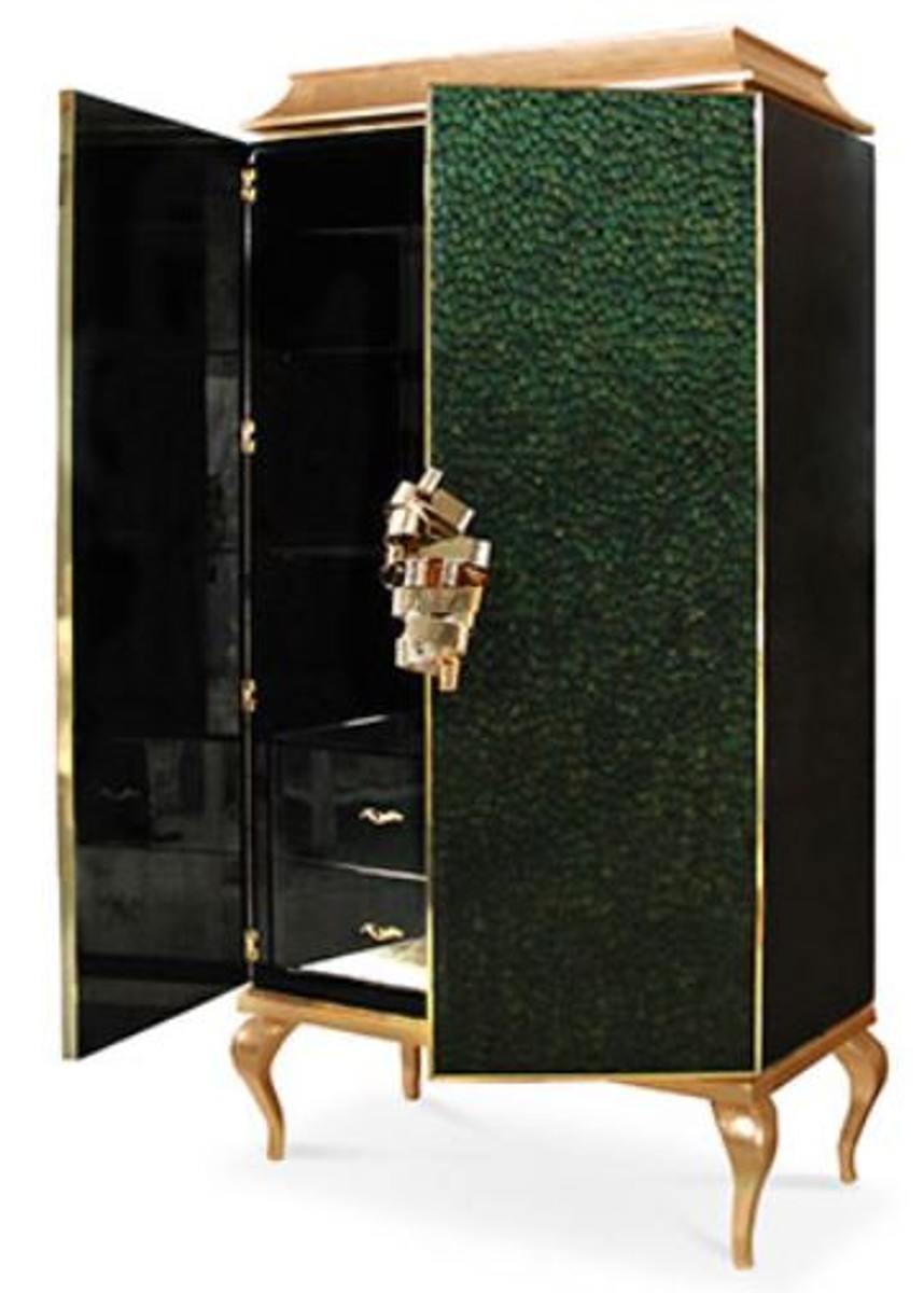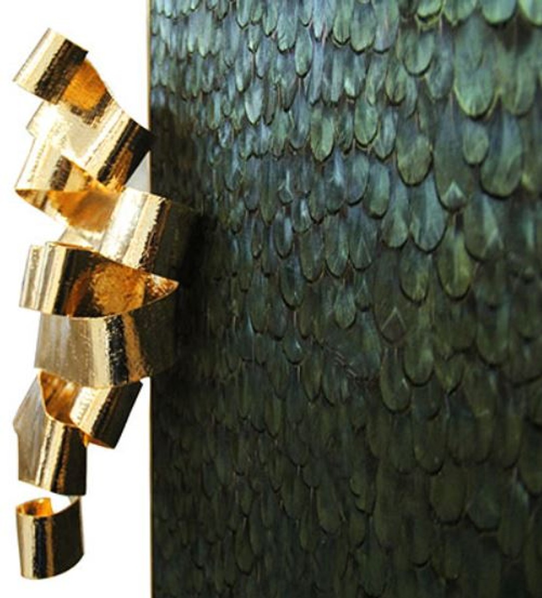 Dieser wunderschöne und exquisite Doppeltürschrank ist mit zarten und individuellen platzierten Naturfedern bedeckt. Ein exquisites Metallband öffnet die Türen zu einem aufwändig gestalteten Interieur mit vier Schubladen und zwei verstellbaren Regalen. Dieser Schrank ist ein absolutes Muss für jede moderne Einrichtung.